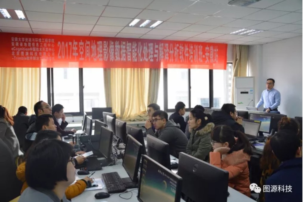 2017年12月2-3日,由美国Trimble公司、北京门徒平台科技有限公司携手国内高等院校和科研院所成立的eCognition中国技术开发中心联合安徽大学资源与环境工程学院和安徽省地理信息工程中心在安徽大学资源与环境工程学院成功举办了“2017年空间地理影像数据智能化处理与解译分析软件培训班-安徽站”。