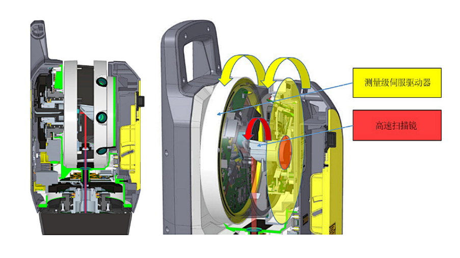 X-Drive双垂直偏转系统在扫描的高速偏转单元上使用了一个全站仪上著名的垂直伺服系统,开启了诸如自动校准、倾斜测量和激光指示器的新功能。全站仪垂直驱动和角度编码器系统仍然集成在照准部内,因此包括偏转单元和EDM源在内的整个中心单元可以像全站仪一样以传统方式围绕横轴旋转。