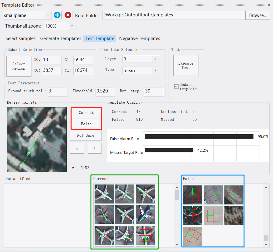 4进行样本的测试与应用(Test template),将正确的飞机样本归为Correct、将错误的飞机样本归为False;