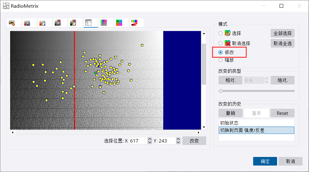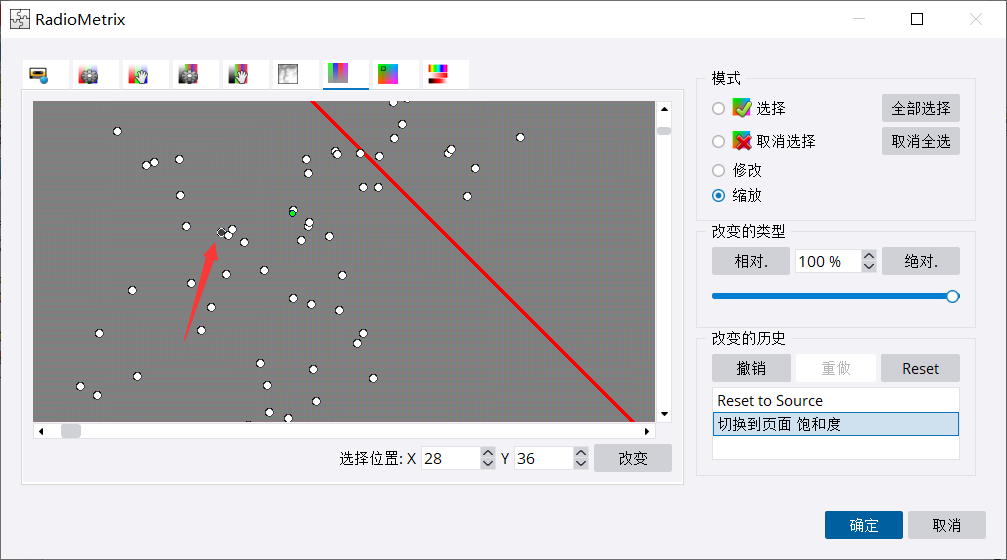 用缩放工具,拉框进行缩放,然后就能看到一个蓝色的点,这个点就是代表参考片。黄色点是需要调色的影像。绿色点是所有影像的色彩均值。