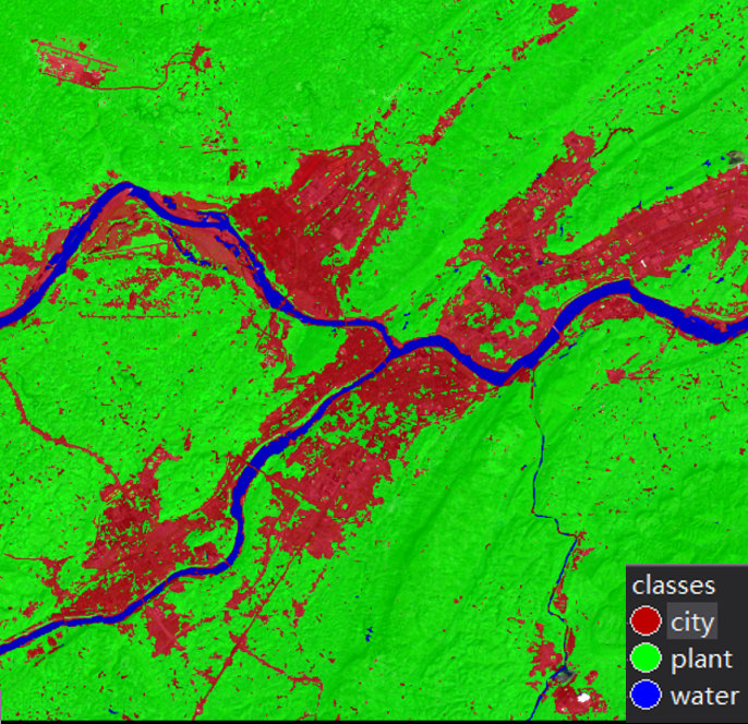 3.最邻近分类算法的应用结果---建设用地、水体与植被类型分类结果如下所示